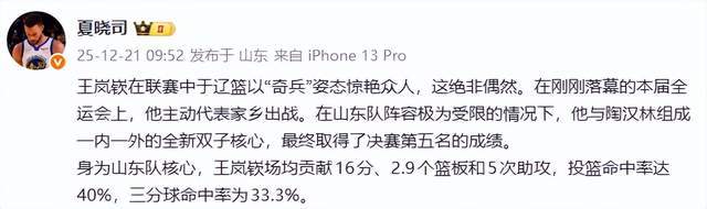 看到王嵐欽如此勇猛,山東媒體人夏曉司也忍不住了,在12月21日上午,通過社交平臺發聲,盛贊這位遼寧男籃的奇兵。夏曉司是這樣說的——
