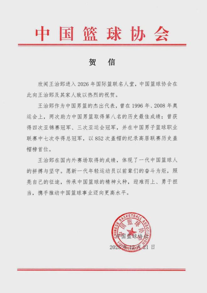 同日,中國(guó)籃協(xié)發(fā)賀信,祝賀王治郅入選2026年國(guó)際籃聯(lián)名人堂。