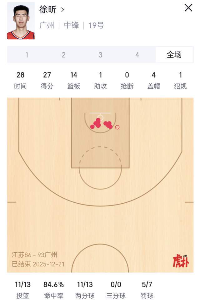 12月21日晚上,在丹陽(yáng),江蘇男籃的主場(chǎng),徐昕用行動(dòng)給出了最響亮的回應(yīng)。27分鐘的上場(chǎng)時(shí)間里,他13投11中砍下27分14籃板4蓋帽,三項(xiàng)數(shù)據(jù)均位列全隊(duì)第一。當(dāng)他在第三節(jié)連續(xù)完成三次暴扣時(shí),現(xiàn)場(chǎng)解說(shuō)驚呼:"這簡(jiǎn)直是約基奇式的表演!"而就在同一晚,焦泊喬在廣東對(duì)陣青島的比賽中,20分鐘僅得9分6籃板。