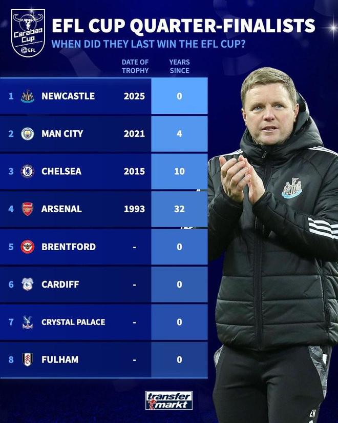 英聯杯四分之一決賽將于本周打響,在此之際,德國轉會市場列出了本賽季八強距離上次奪冠時間的榜單。