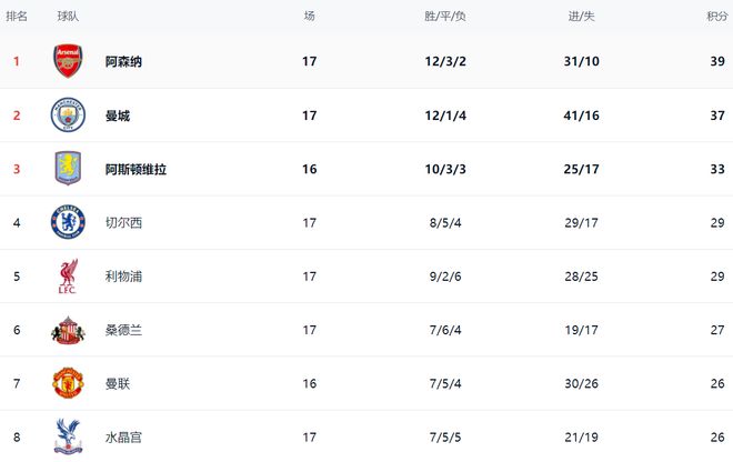 在積分榜上,阿森納以39分排名榜首。曼城拿到37分,以2分的劣勢排名第2。第3的是阿斯頓維拉,拿到33分。不過,阿斯頓維拉少賽一場。切爾西以29分排名第4。利物浦贏球之后,總積分也達到29分,升到了第5名,距離歐冠區只有一步之遙。桑德蘭27分排名第6。曼聯26分排名第7。水晶宮也是26分,排名第8。熱刺只拿到22分,排名第13。