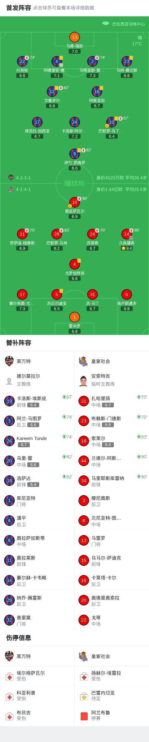 北京時間12月20日,西班牙足球甲級聯賽第17輪展開角逐,萊萬特坐鎮主場迎戰皇家社會。上半場補時階段,久保建英為皇家社會率先破門。易邊再戰,雙方均未能改寫比分,直至下半場補時第4分鐘,阿德里安-德拉富恩特主罰點球命中,幫助萊萬特扳平比分。最終全場比賽結束,萊萬特與皇家社會以1比1握手言和。