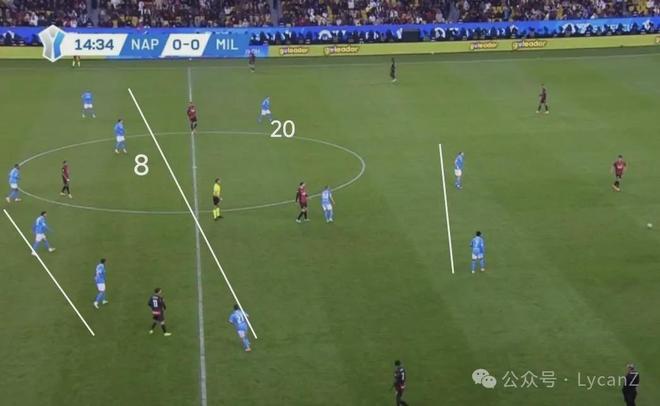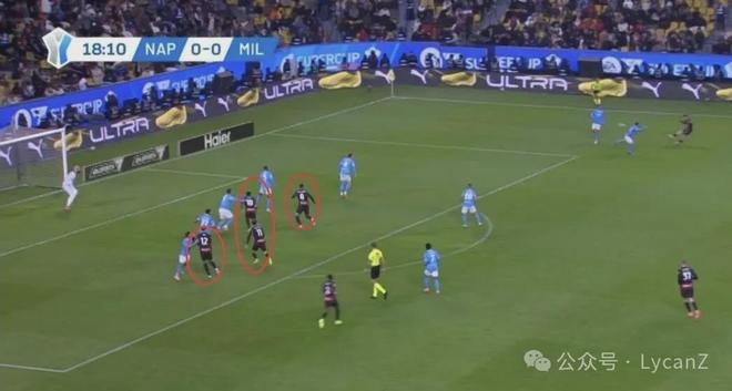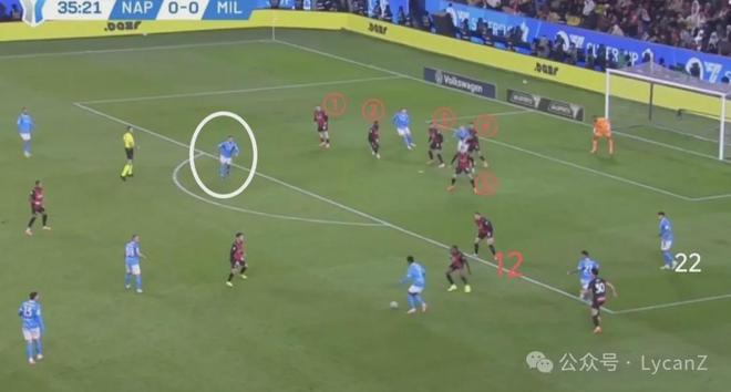 對手只用霍伊倫和麥克托米奈兩人就把米蘭五個防守人員牽制在禁區內,原本跟防迪洛倫佐的拉比奧特也因為內雷斯的內切轉為協防站位。于是那不勒斯隊長空出來了,弧頂的埃爾馬斯無人限制,波利塔諾在輕松插上。