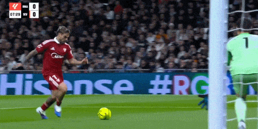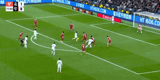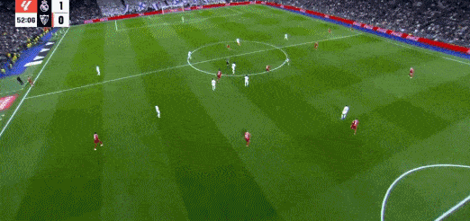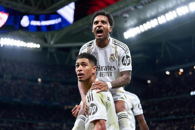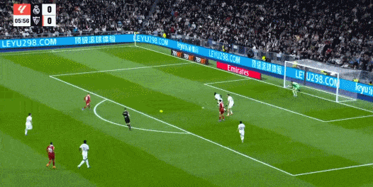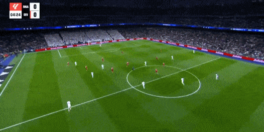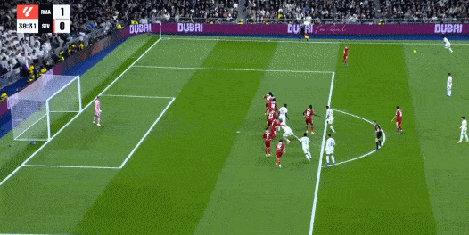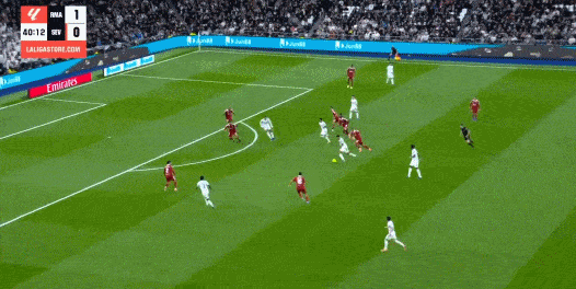 第38分鐘,皇馬前場右側任意球機會,羅德里戈將球罰向禁區,貝林厄姆高高躍起頭球攻門得手,皇馬1-0塞維利亞。
