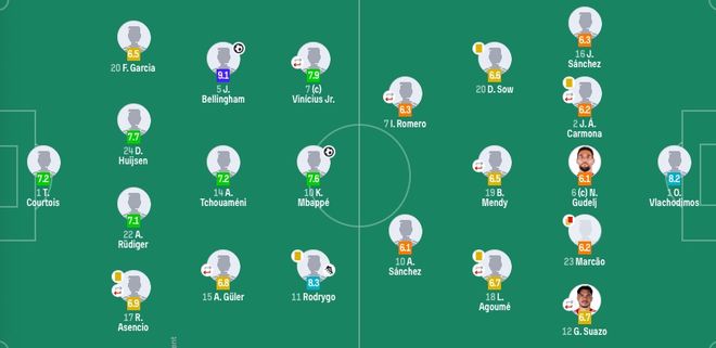 皇馬首發:1-庫爾圖瓦、17-勞爾·阿森西奧(93'35-大衛·希門尼斯)、22-呂迪格、24-赫伊森、20-弗蘭·加西亞、14-瓊阿梅尼、15-居萊爾(72'6-卡馬文加)、5-貝林厄姆、11-羅德里戈、7-維尼修斯(83'16-貢薩洛·加西亞)、10-姆巴佩
